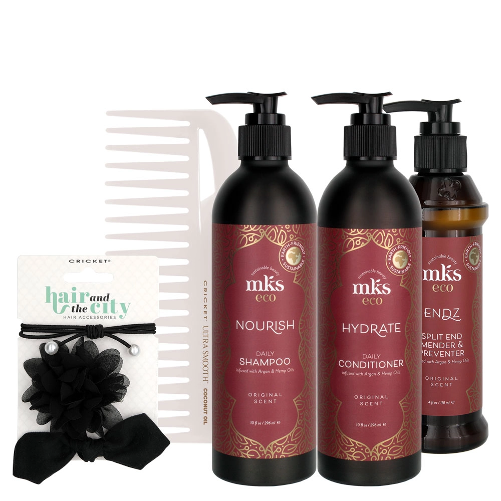 Add an extra pop of fun to your hair with the Cricket Hair and the City Hair Accessories – Not So Basic Black. This three-piece hair tie set adds chicness to ponytails and bobs and makes a statement with every style. These classic hair accessories add the perfect touch to complete your style. MKS Eco Nourish Daily Shampoo 10oz MKS Eco Hydrate Daily Conditioner 10oz MKS Eco Endz Split End Mender & Preventer – Original Scent 4oz Cricket Ultra Smooth Coconut Oil Conditioning Comb 1 piece Cricket Hair and the City Hair Accessories – Not So Basic Black 3-piece Set