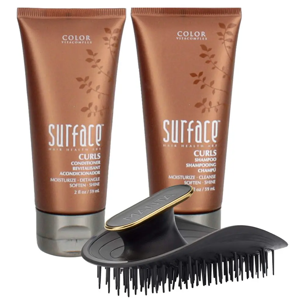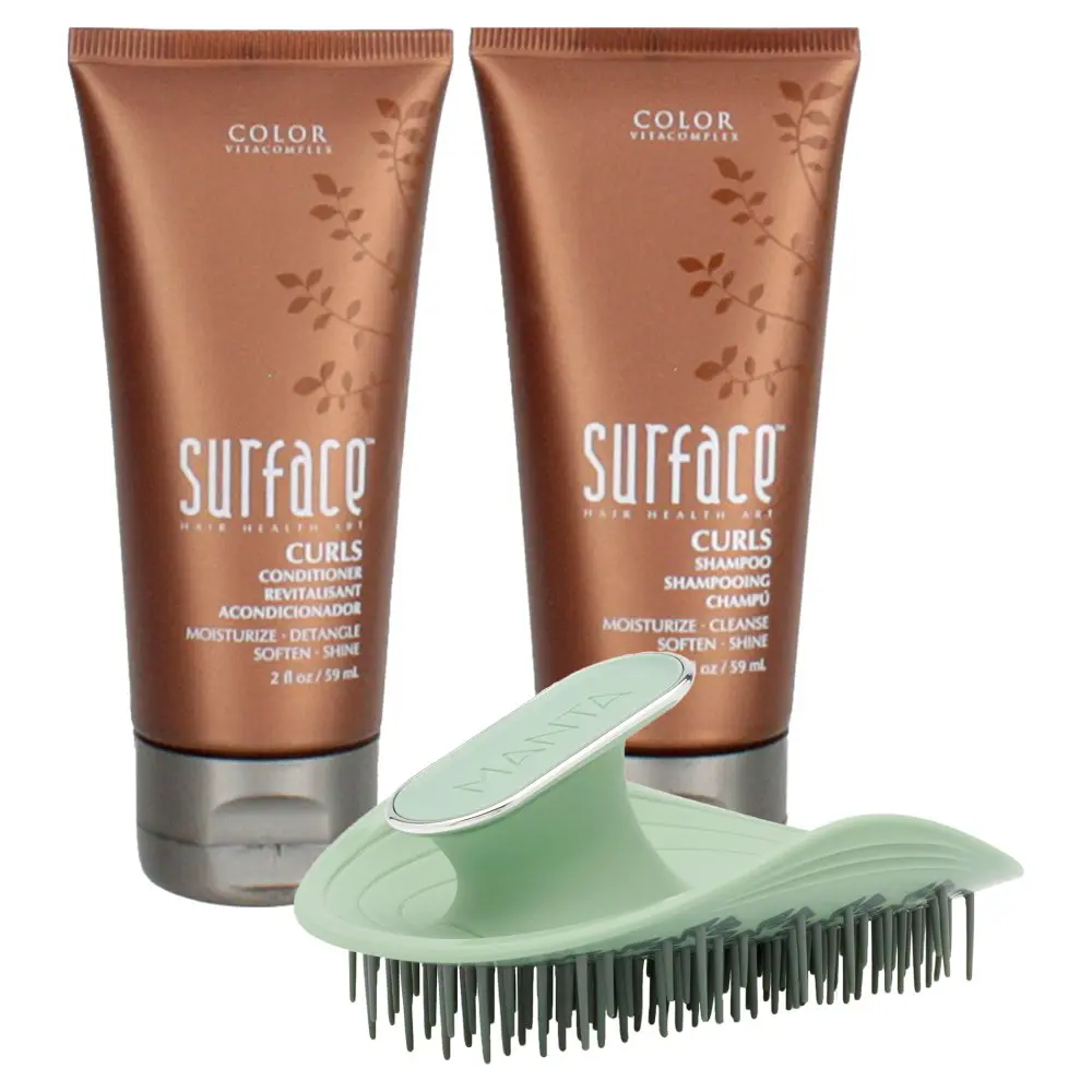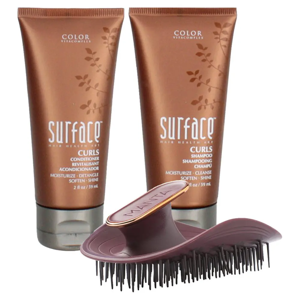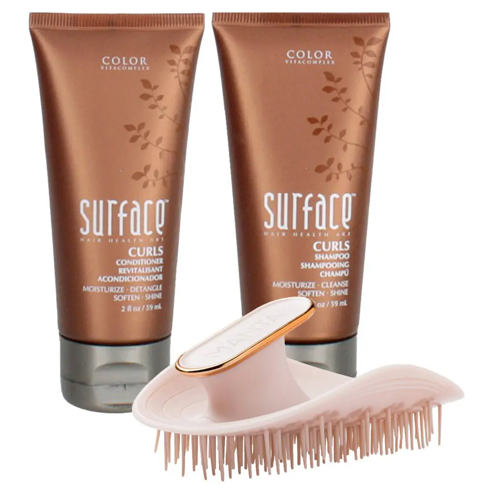 This set features the Surface Curls Shampoo and Conditioner, an ultra-hydrating set designed with your curls in mind! The Curls Shampoo features a rich lathering formula that will instantly nurture your curls back to life with the help of the melting moisture of Cocoa Butter and hydrating Babassu Seed Oil. When paired with the Curls Conditioner, this pair packs a punch! This shampoo and conditioner help to detangle, hydrate, boost shine, and lock in moisture all without adding any weight to your curls and coils. The elasticity of your curls is instantly improved with the help of Cocoa Butter, Vitamin K, and magnesium, while amaranth protein helps to strengthen each hair strand and reduce frizz. Like all other Surface shampoos and conditioners, the Curls line is formulated with Surface’s Color Lock Vita Complex to help seal in color and block out harmful UV rays that can dull hair over time.