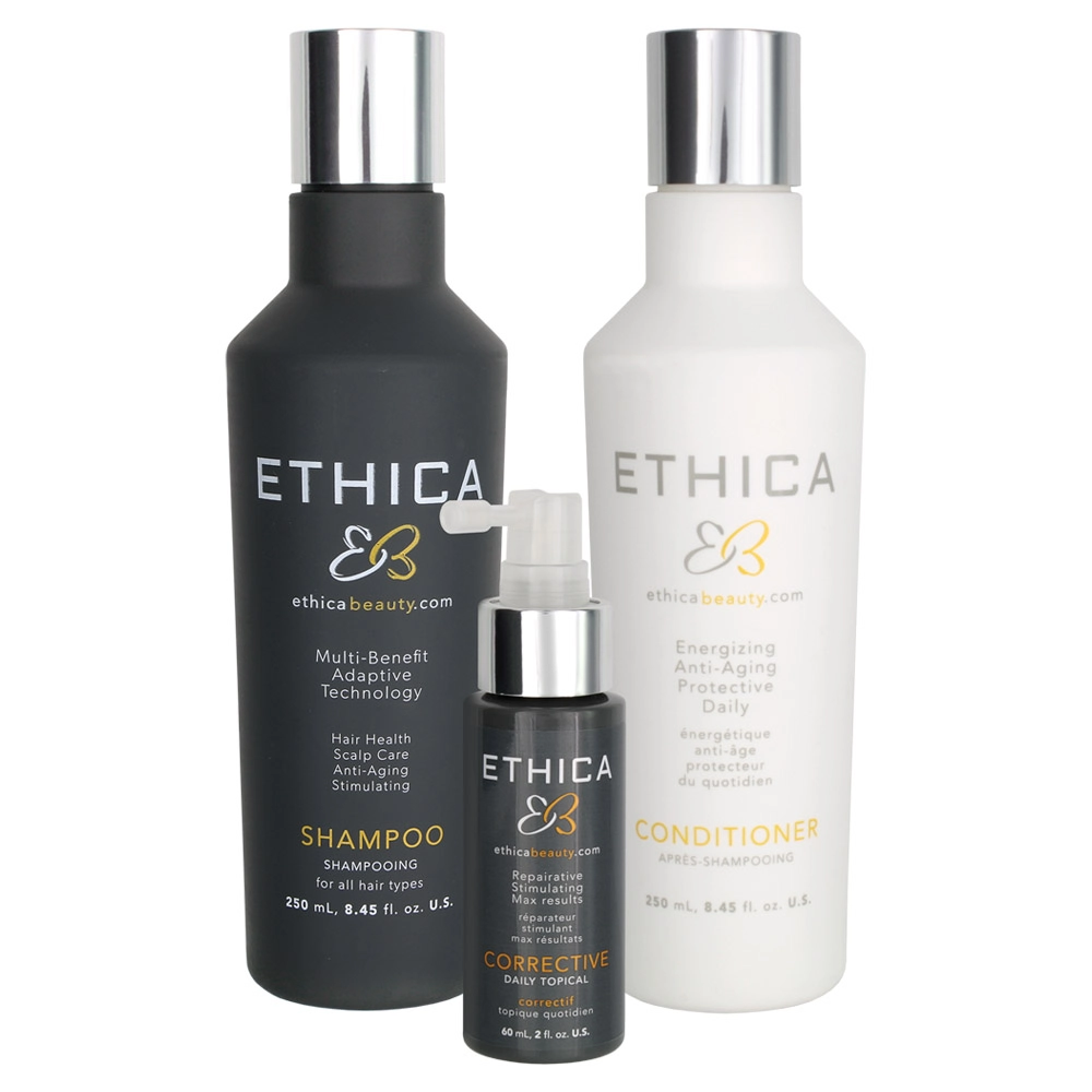 Corrective Daily Topical: Apply up to 7 sprays directly to the scalp. Focus on desired or thinning areas. Use twice per day. Applying more extra sprays, or more than twice a day does not increase results. Gently rub the liquid in evenly, focusing on the scalp. Ethica Corrective Daily Topical absorbs very quickly. You do not need to keep massaging in after absorption. Do not rinse. Wash hands after use. Apply on a consistent schedule whether hair is wet or dry or has been washed or not. Note: 7 sprays twice a day is for maximum potential. If your needs are for smaller areas of concern, such as strengthening the temporal or frontal region only, you may find you need to use only three to four sprays once or twice a day. Adjust usage depending on your needs, speed of desired results and area of coverage. Men with male pattern baldness will most likely need the maximum 7 sprays twice daily to combat the aggressive nature of MPB.