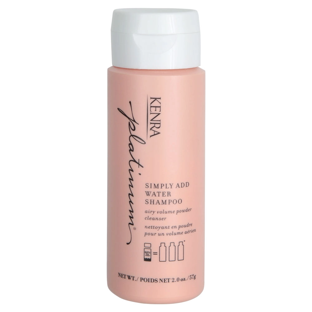 Kenra Platinum Simply Add Water Shampoo is a powder shampoo. This lightweight powder turns into a creamy lather simply by adding water. Infused with rice proteins to add airy volume and root lift, Platinum Simply Add Water Shampoo absorbs oil and gently cleanses. This residue-free shampoo is bottled in 98% recycled plastic. With no water, this potent powder is TSA approved and lightweight. One bottle of Kenra Platinum Simply Add Water Shampoo is the same as three 8.5 oz bottles.