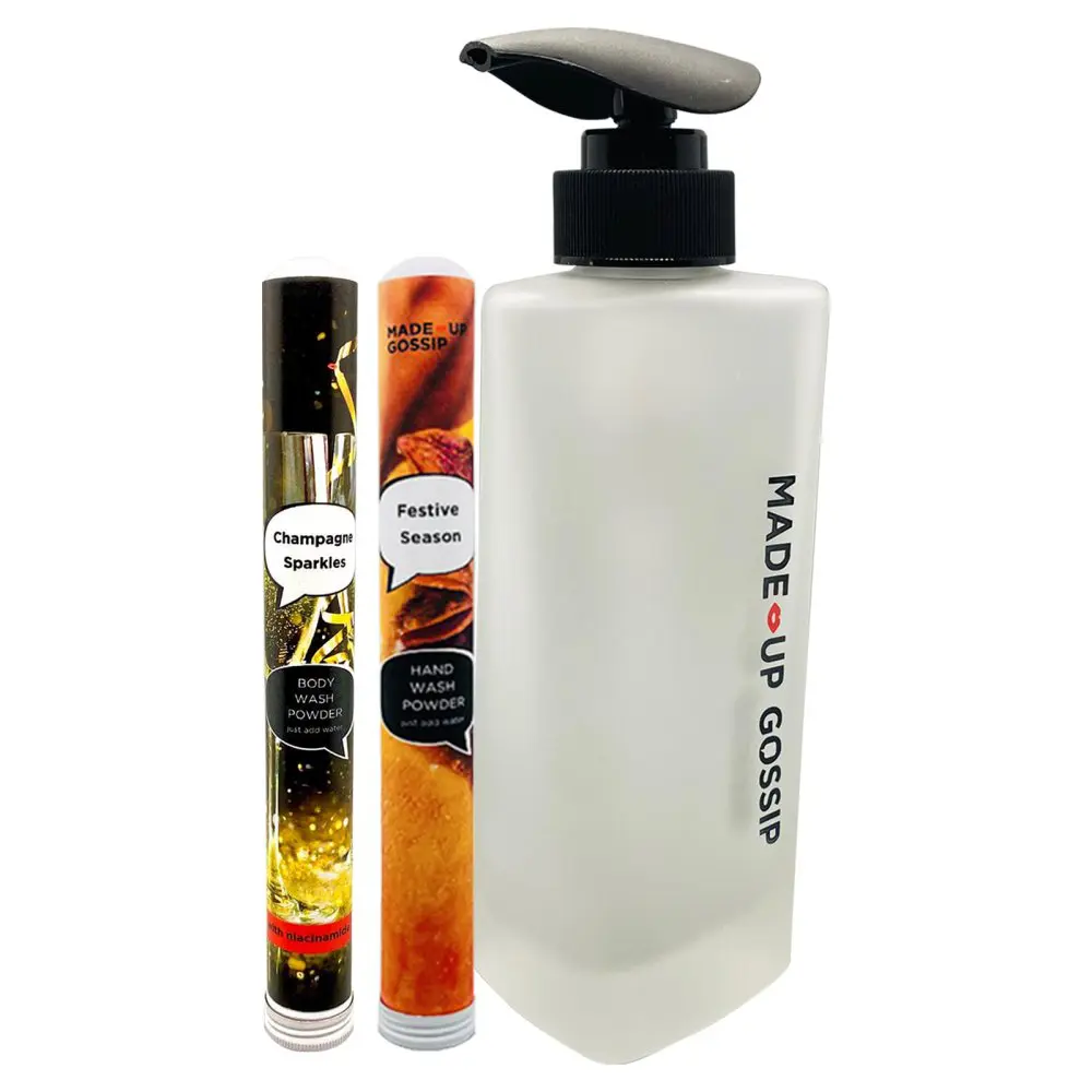The Made-Up Gossip Holiday Sprinkles Set features the Made-Up Gossip Hand Soap Powder in the scent Festive Season, the Made-Up Gossip Body Wash Powder in the scent Champagne Sparkles, and the Made-Up Gossip White Frosted Glass Bottle to help you transform your personal care routine this holiday season. This eco-friendly hand soap and body wash are packed in environmentally friendly aluminum tubes that are 100% recyclable. They are formulated with eco-friendly and non-toxic ingredients, ensuring a rich and luxuriously moisturizing lather. The Made-Up Gossip Hand Soap Powder in the scent Festive Season is a spicy and fruity scent that perfectly captures the spirit of upcoming holidays. Clove sticks, vanilla buds, sweet apples, and oranges. Paired with the Made-Up Gossip Body Wash Powder in the scent Champagne Sparkles will put you in a celebratory mood. The scent features a fresh, clean scent of light sparkling citrus and light musk. These delicious hand wash and body wash powders are accompanied by the Made-Up Gossip White Frosted Glass Bottle to effortlessly help you dispense your new favorite products with ease. This sophisticated and contemporary bottle is equipped with a lotion pump for your convenience and engineered to provide precise water measurements when mixing with your Hand, Body, and Facial Cleansing Powders from Made-Up Gossip.