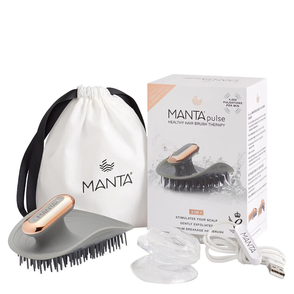 This versatile brush can be used multiple times in your hair care routine. Use it while shampooing to get a really deep-down clean and as a scalp exfoliator, for even application of hair treatments, while blowdrying, as a head massager, detangler, styler, and shine enhancer. Ideal for all ages and hair types the Manta Pulse Brush is gentle enough to be used on extensions and wigs, as well as fragile and sensitive hair, and children’s hair. Its small and compact size makes it easy for anyone of all ages to brush and style their hair. The arthritis society selected Manta brushes as the easiest to hold. Ultra-gentle: Minimum breakage, maximum shine Flexible super-soft bristles Ultra-hygienic medical-grade materials Bendable base mold to the shape of your scalp True ergonomic design – like a glove with a non-slip grip Heat-resistant up to 175 degrees F Portable: feather-light comes with a handy travel bag Patented Flexguard technology Anti-static 100% recyclable Vegan and cruelty-free Electric scalp massager stimulates the scalp with 2,000 or 4,000 pulsations per minute Water–resistant up to 12m deep Shower Holder & Pouch