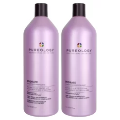 The Pureology Hydrate Shampoo & Conditioner Liter Duo provides gentle protection for your hair while preserving its vibrant color, opulent texture, and optimal moisture. Infused with the natural nourishment of Jojoba, your hair experiences a profound infusion of replenishing moisture, resulting in a luxuriously smooth feel that exudes vitality. The presence of Green Tea promotes a harmoniously refreshed scalp, creating the perfect ambiance for thriving, gorgeous locks. Going beyond these advantages, the esteemed botanical treasure, Sage, takes the spotlight, rousing your hair follicles to promote robustness and resilience from root to tip. Additionally, the dynamic combination of Menthol and Mint awakens your senses and delivers an invigorating, lasting tingle that revitalizes long after your shower time.
