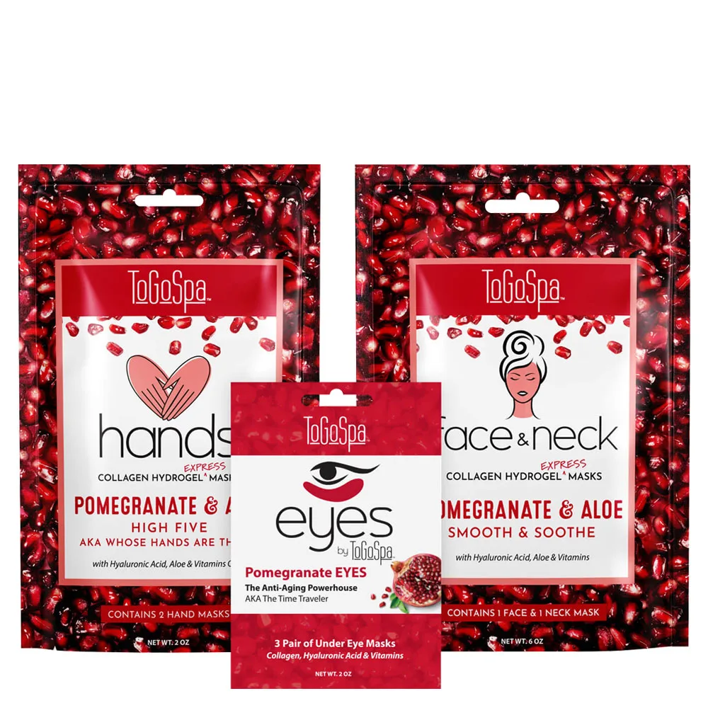 Set Includes: 1 Pack Pomegranate EYES Mask 2 Packs Pomegranate & Aloe HANDS Mask 2 Packs Pomegranate & Aloe FACE & Neck Mask
